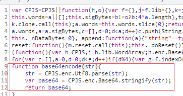 6.获取到getsign()函数的返回值之后就可以当作参数获取base64加密后的参数了,下面就是进入 base64encode(JSON.stringify(post_obj));函数调试的源代码,发现就是一个base64加密方法,需要把这一段的方法函数拿到。